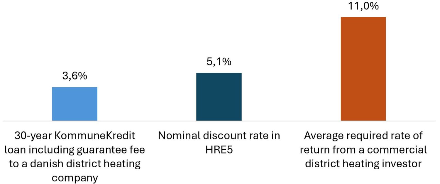 In comparison, Heat Roadmap Europe 5 (HRE5) [4] , which outlines a cost-effective strategy to decarbonize heating in Europe, uses a real discount rate of 3% a year to evaluate investments. A discount rate is used to translate future costs and benefits into today’s value. It reflects that money today is worth more than money in the future. The 3% is a real rate (excluding inflation). With inflation of around 2%, this corresponds to a nominal rate of roughly 5%.