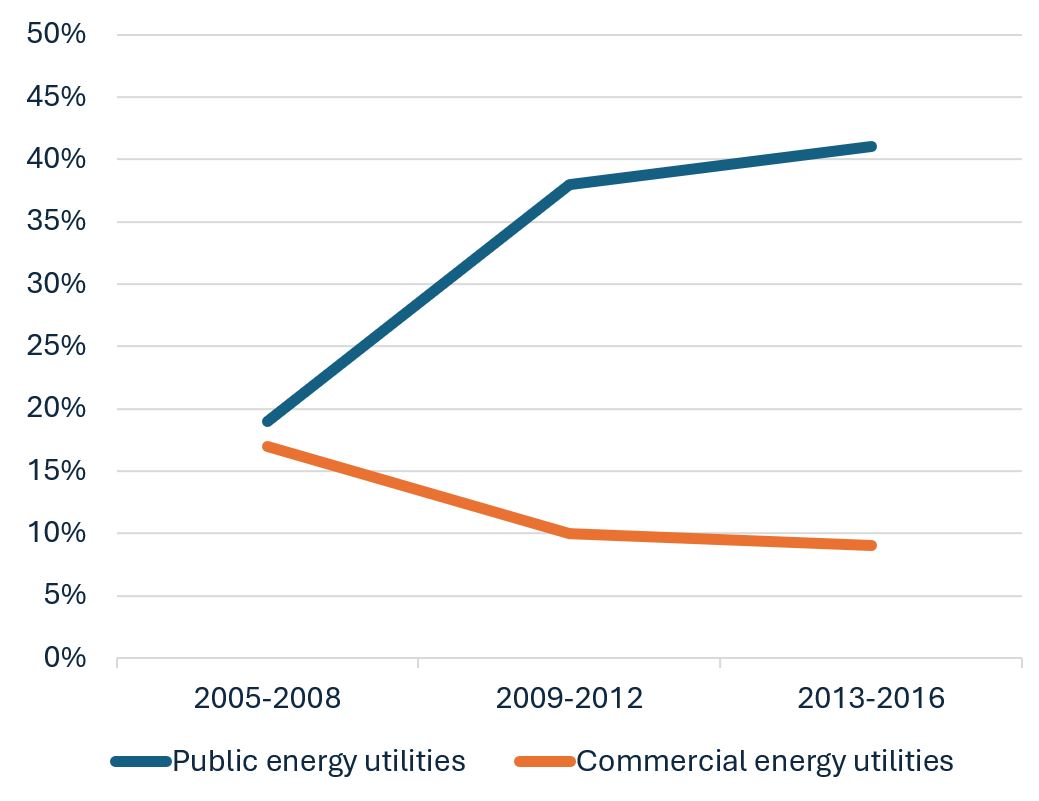 Likewise, research from the OECD has found that a higher level of public ownership among electric utilities is associated with significantly higher investment in renewables. A 10-percentage-point higher share of public ownership in the energy sector was associated with a 31% increase in investment in renewable energy. In comparison, introducing a typical state aid scheme for renewables, a feed-in tariff, was associated with a 10% increase in renewable investment.
